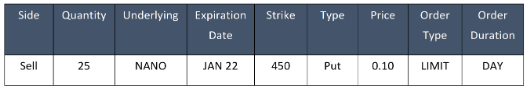 Before we discuss transaction types, we need to understand the components of an options order. The options order contains all the relevant information needed to purchase or sell an options contract. Here is an example order: