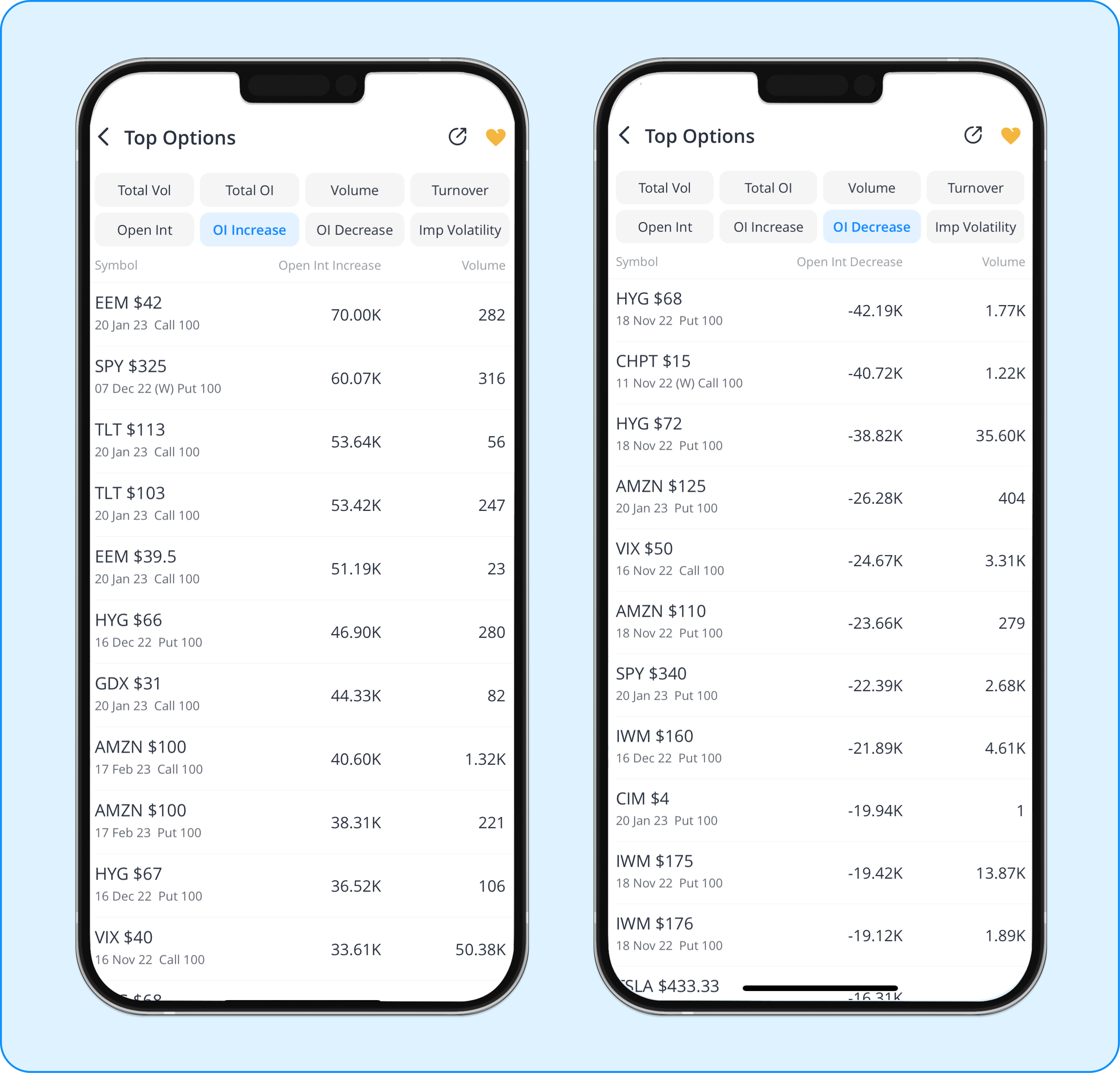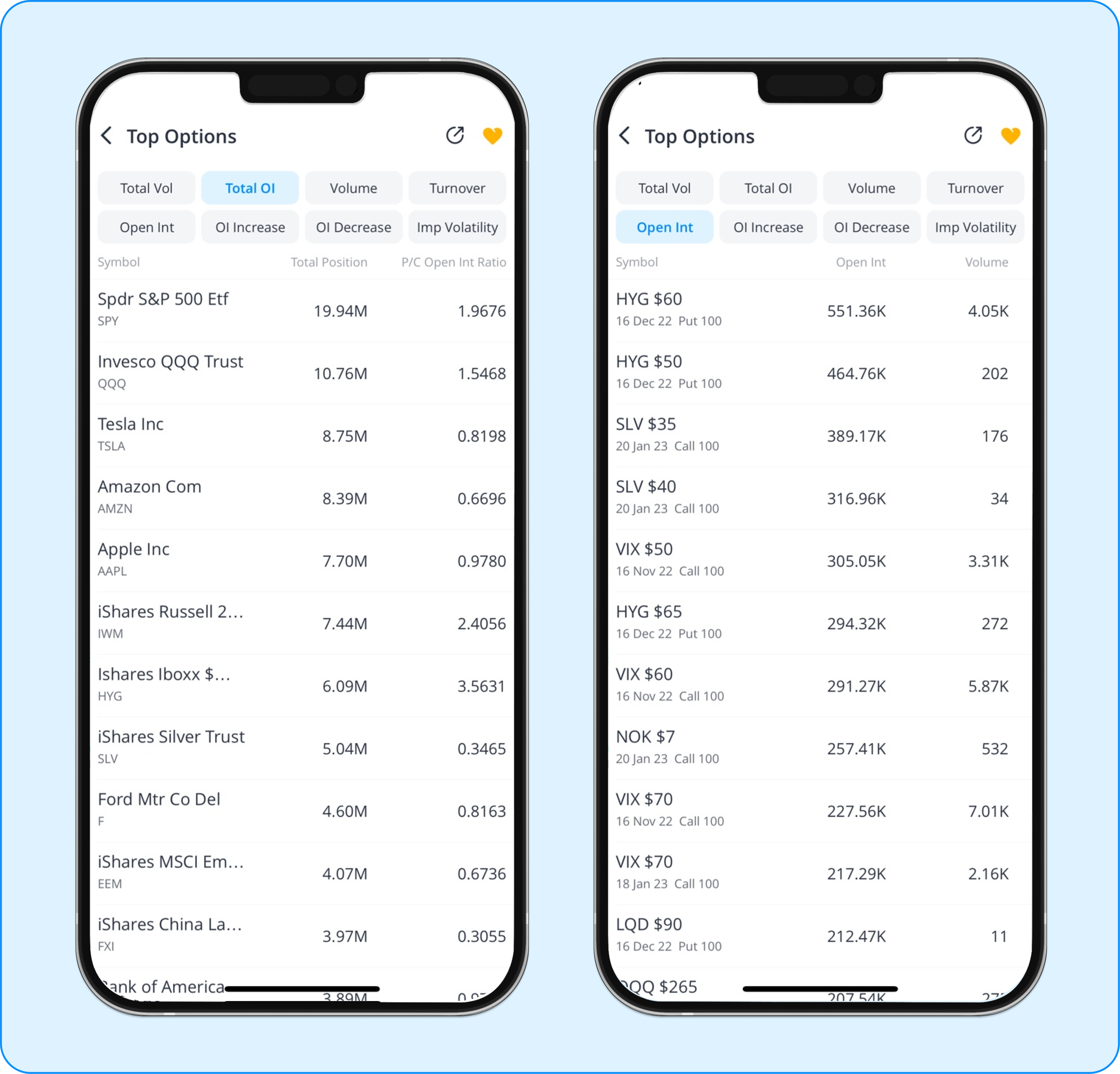 Webull provides two types of lists that rank the open interest from high to low according to underlying symbol and individual option contracts.