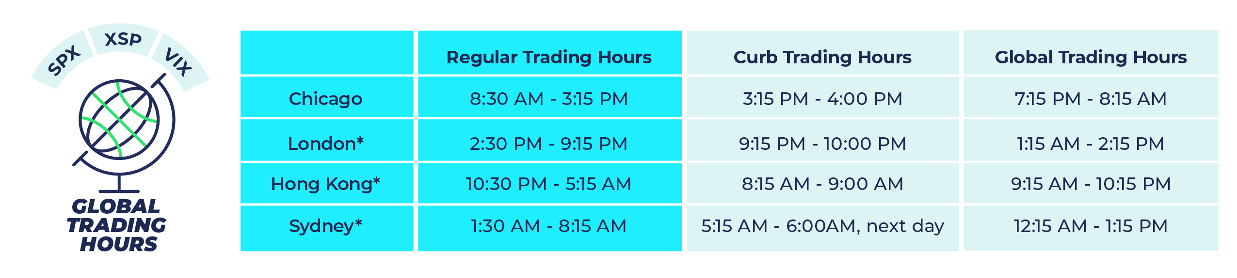 In addition to GTH, a brief Curb session following Regular Trading Hours (RTH) is available for traders to adjust, unwind, or close out trades. Curb sessions are all electronic trading, 3:15 p.m. – 4:00 p.m. CT Monday through Friday and are limited to SPX®, XSP® and VIX® options only. SPX FLEX® options can also be initiated. All activity during the Curb session will have the same Trade Date as the preceding RTH session. This in turn maximizes the time overlap with related future contacts. All hours are shown in each city's respective time zone: