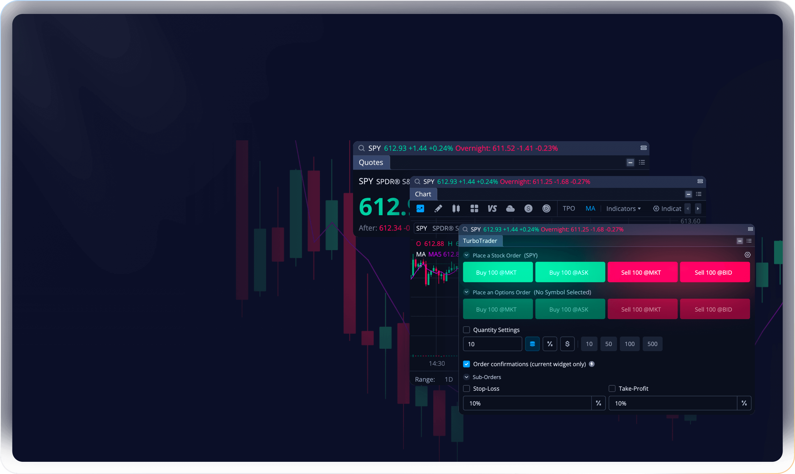 On the desktop, you can customise your trading buttons and trading panel. You can quickly define the number of orders in different ways, and set the entry, take profit or stop loss for orders in different ways.